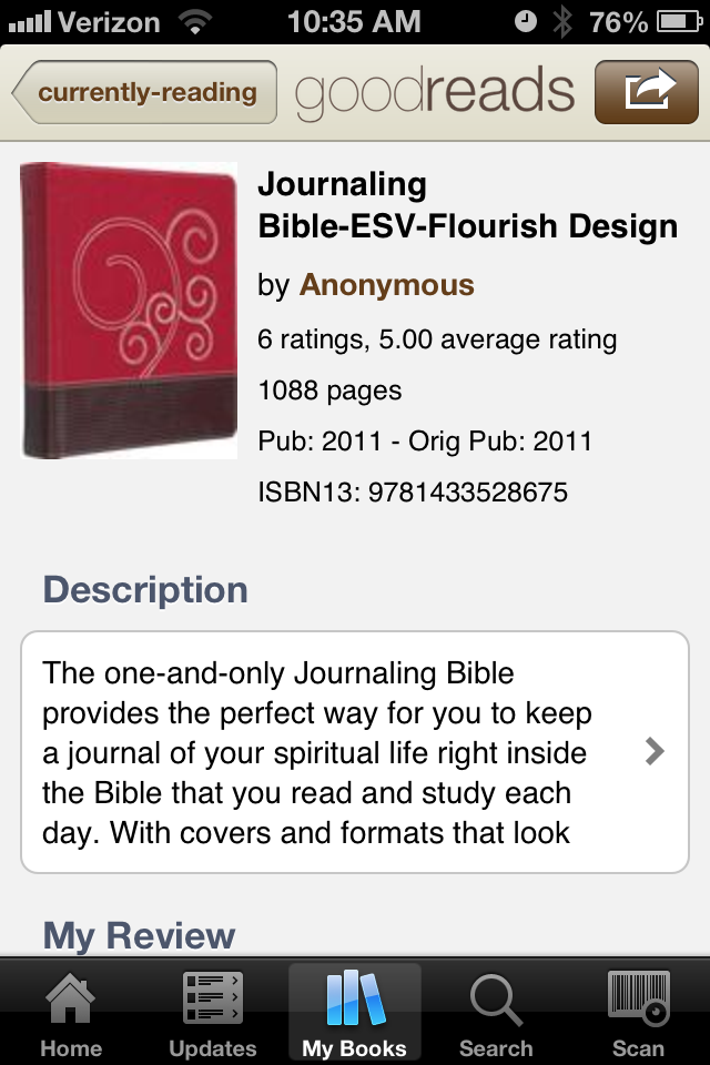 The picture below is a screen capture from my iPhone. It is taken from an app that links with the website Goodreads.com. Goodreads is a social media site designed to track progress, share review, and explore in general books. You can keep up with what you are currently reading, offer mid-book reviews, see what your friends are reading, etc…